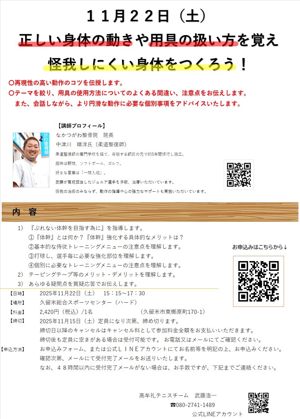 「11/22(土)正しい身体の使い方&用具の扱い方勉強会」のお申込みはこちらからどうぞ♪