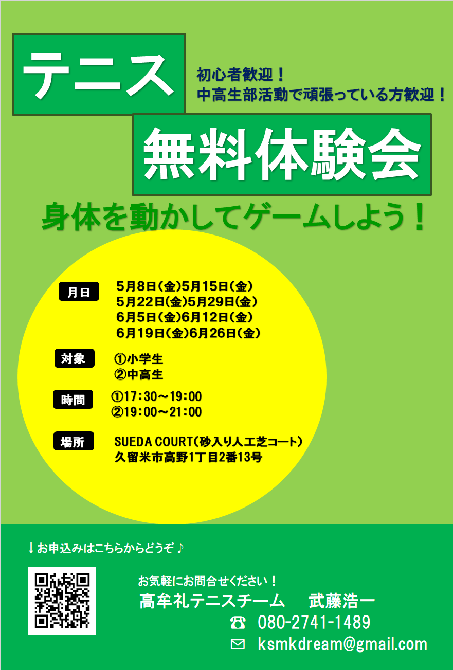 『高牟礼テニスチーム』では、テニスをやってみたい!もっとやりたい!小学生を対象とした『小学生クラス』と部活動で元気に頑張っている中学生・高校生を対象とした『中高生クラス』の新規メンバーを募集いたします!