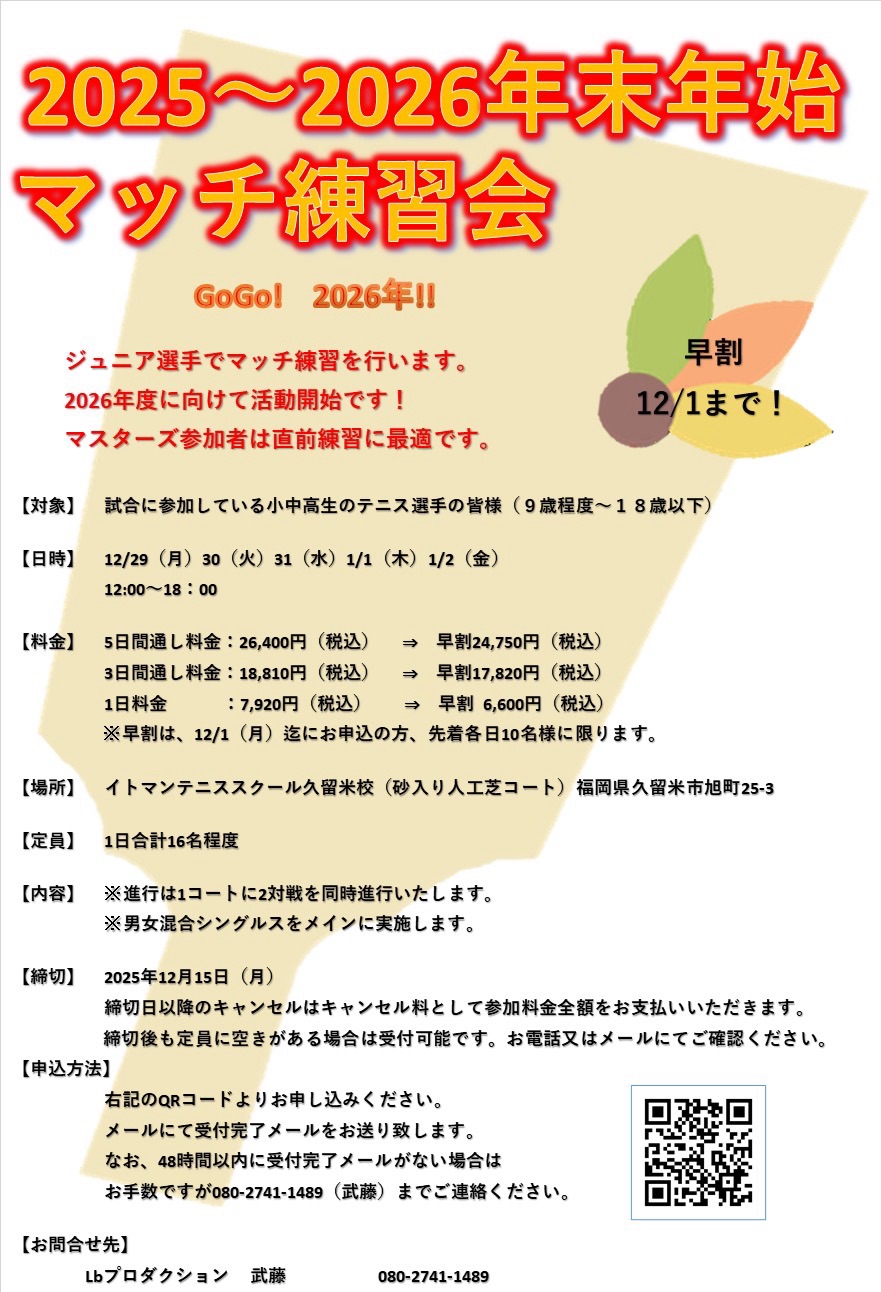 2025年12月29日(月)~2026年1月2日(金)の5日間、今年もイトマンテニススクール久留米の施設をお借りして、マッチ練習会を実施します!