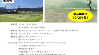 大会 10月13日(月祝) 中高生&小学生ハードコートシングルス大会 ●10月13日(月祝) 中高生&小学生ハードコートシングルス大会 10月13日(月祝)に大会を実施します! 中高生対象カ... 2025.09.09 大会